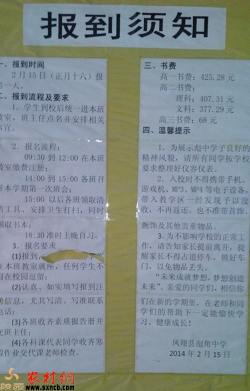 報到須知是為了順利搞好開學(xué)各項工作安排,時間安排、收費情況(學(xué)費、書費、住宿費等)、報到流程。其目的就是讓學(xué)生家長明白,接受社會監(jiān)督。然而,鳳翔縣彪角中學(xué)在報到須知中不公示學(xué)費、住宿費,其中有什么貓膩?書費全縣已經(jīng)確定了,書也發(fā)放完畢,總務(wù)主任為什么說不清。對于鳳翔縣教育主管部門開學(xué)收費檢查工作是如何做的?學(xué)生何時才能拿到多收的費用和票據(jù)?本報將予以跟蹤報道!
