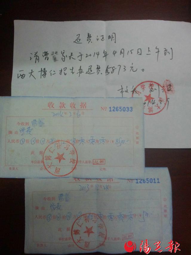 昨日上午,家住咸陽市禮泉縣的曹師傅來到報社稱,自己和妻子兩個人都在西安打工,孩子小曹今年上初三,去年給孩子在西安找了一個名叫“西大博仁補習”的學校(以下簡稱博仁學校)上學,每學期學費是9000元。去年上的好好的,今年剛開學就發生了令曹師傅意想不到的事情。