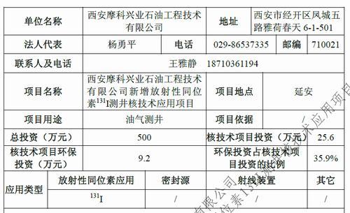 西安摩科興業(yè)石油工程技術有限公司新增放射性同位素131I測井核技術應用項目