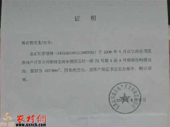 2013年8月1日給苗郁林出具苗郁林購房和房屋產權證正在辦理中的證明。
