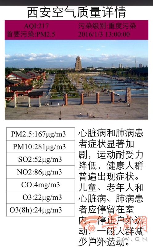 1月1日中度污染,1月2日重度污染,根據西安市氣象局預測,西安市環境空氣質量將進一步呈惡化趨勢。2日下午,西安市治污減霾辦啟動今冬首次重污染天Ⅱ級(橙色)應急響應。