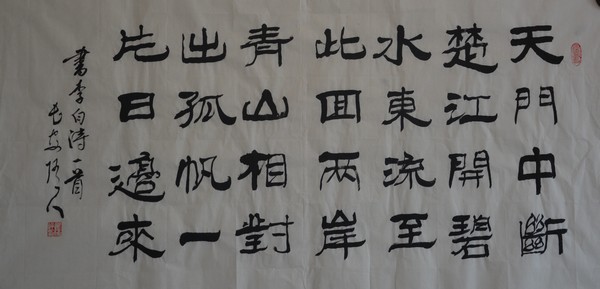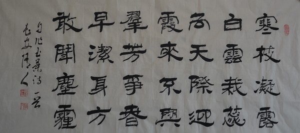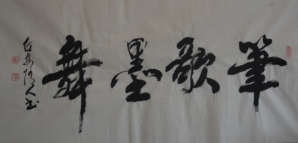 近年來他走創新的路子,創作出一種個性特點突出的新字體,成功地將篆、隸、魏、行諸體巧妙結合,使之具有篆的韻味,隸的沉穩,魏的莊重,行的活潑,深受人們贊許和歡迎。