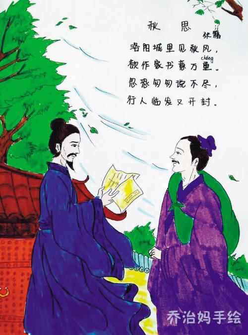 很多古詩都沒有有趣的解釋和圖片說明,為何不能在學習古詩的時候畫出詩文描述的場景呢?喬治媽開始為《秋思》配圖。喬治媽畫作中,抓住了秋風這個重點,畫作中秋風不但吹搖了樹枝、吹落了葉片,更吹蕩起詩人的衣袖。畫中藍衣是詩人張籍,紫衣身負包裹的就是將要回鄉的友人。
