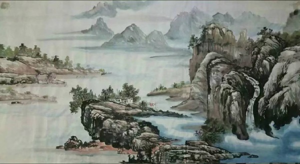 擅長于花鳥畫是王學(xué)藝的一個特點,但他筆下的山水畫同樣也別具風(fēng)格、多姿多彩,有一種超脫時空的意蘊!遠山、近水、云霧、奇石還有點綴其中的山野人家,雖不顯山露水卻和山水奇石自然而然地融為一體彼此呼應(yīng)和諧共生,一幅磅礴大氣的生動畫卷美景撲面而來使人觀之心曠神怡。