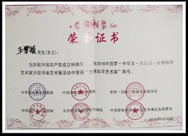 其畫作在美、日、韓和港澳臺等地多次展覽,被各地知名人士收藏。2007年被授予中國藝術(shù)功勛成就獎、中國藝術(shù)先鋒等榮譽稱號。畫作被編入《一代偉人》、《中國藝術(shù)》、《中國書畫名人錄》、《中華文藝家》、《中國當(dāng)代書畫藝術(shù)大家》等書刊。