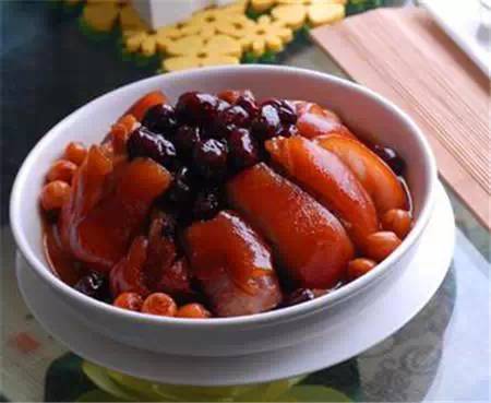 5、30分鐘后,取出豬腳肉并用漏勺將配料紅棗、白蓮子等與湯汁分開;