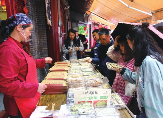 作為此次“絲綢之路陜菜國際美食節”的另一個展區,西安市中山門里的永興坊以“非遺文化美食展”吸引了大批市民和外來游客,這里匯聚了陜西11地市107區縣的百余種非遺美食和土特產品,前期以“摔碗酒”成為網紅后,為永興坊積攢了大量人氣,在此次美食節更是熱鬧非凡。
