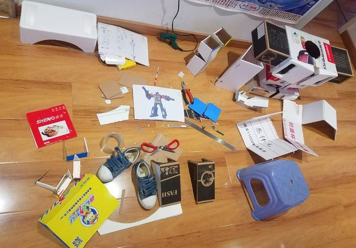 根據(jù)圖紙,劉煒用了6個(gè)紙箱制作了大大小小上百個(gè)零部件,然后用了50多根熱熔膠,將這些部件拼接在一起,做出擎天柱的大概外形,然后將彩色打印紙貼在外面進(jìn)行美化。為了形象更加逼真,劉煒還專門用毛筆沾著打印機(jī)廢棄油墨畫出汽車人的機(jī)器質(zhì)感。 整個(gè)變形金剛高達(dá)一米五左右,重達(dá)10斤,分為頭盔、上衣盔甲、下肢、鞋子、武器幾部分,一共制作了十幾天,每天都要近十個(gè)小時(shí)。