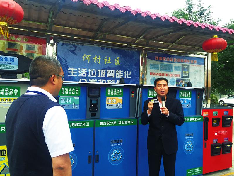 昨天上午,記者來到通遠街道辦事處何村社區,看到沿途道路干凈整潔,每戶村民的家門口都放置著一個綠色的垃圾箱。社區里不時能看到開著電動三輪車巡查、清掃的保潔員,每條街道、每個垃圾收集點周圍環境整潔。來到何村社區廣場旁邊,這里設置了一個智能垃圾分類投放站。一位投放垃圾的村民將紙張、塑料、金屬、玻璃等可回收垃圾裝進橘黃色二維碼垃圾袋,在投放站掃描后,投放至由智能垃圾分類和可回收垃圾箱組成的專用垃圾箱,機器自動稱重后核算出了價格。一位垃圾回收工作人員分揀確認完畢,按垃圾的不同類別,向這位村民返還了積分,并提醒其拿著積分可到指定地點兌換相應的生活用品。
