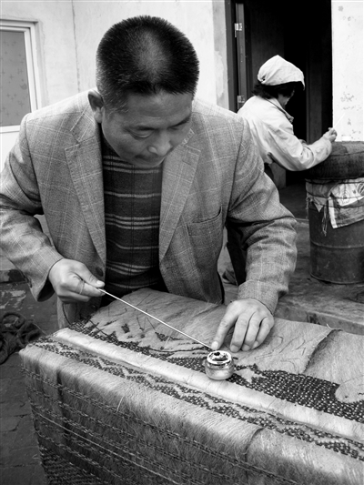劉文艷雙手操持兩把縫針,沾上清油后在棕墊兩面一穿一勾 一折一扣地編織起來。“通過勞動就能見到收入,眼看著日子過得一天比一天好。”
