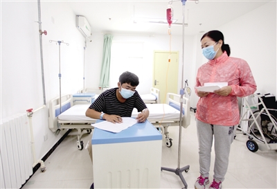 “在病房里考試?”病房外站有病人,想瞧瞧醫院里的考試是啥樣子。得知這里有學生要考試,護士熱心幫忙,專門為特殊考試整理出來空病房,作為這次考試的愛心考場。