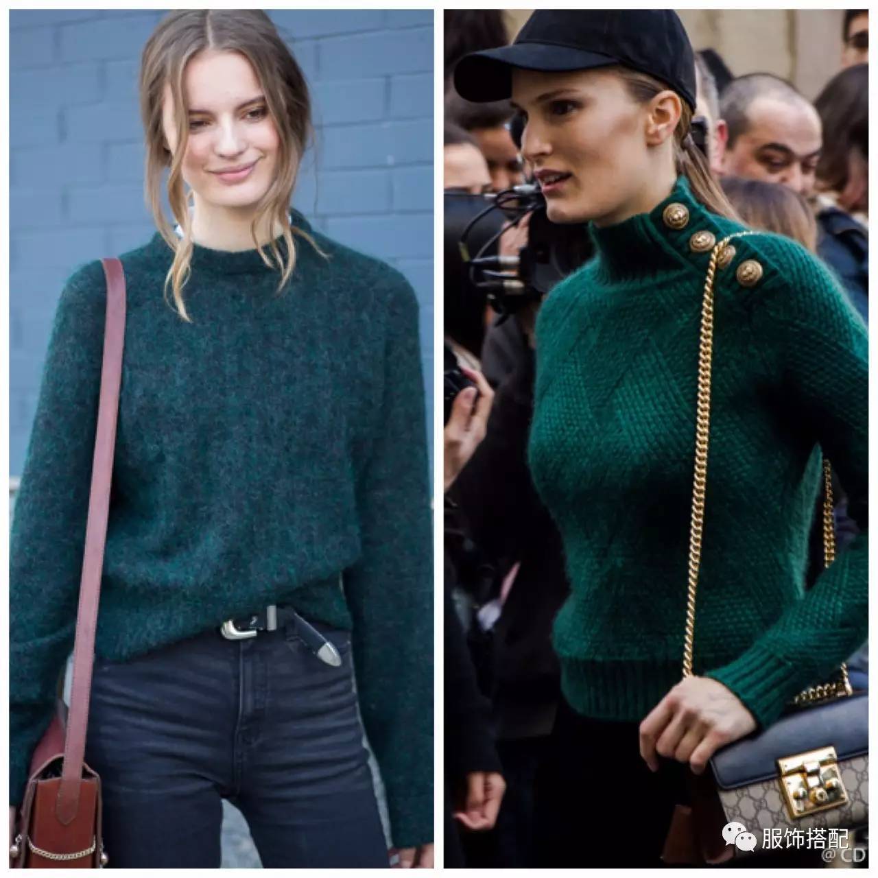 今年秋冬最推薦入手的是暗云杉綠毛衣,尤其是下圖左邊帶絨毛質地的款式,會比普通針織材質(右圖)更能穿出復古腔調。