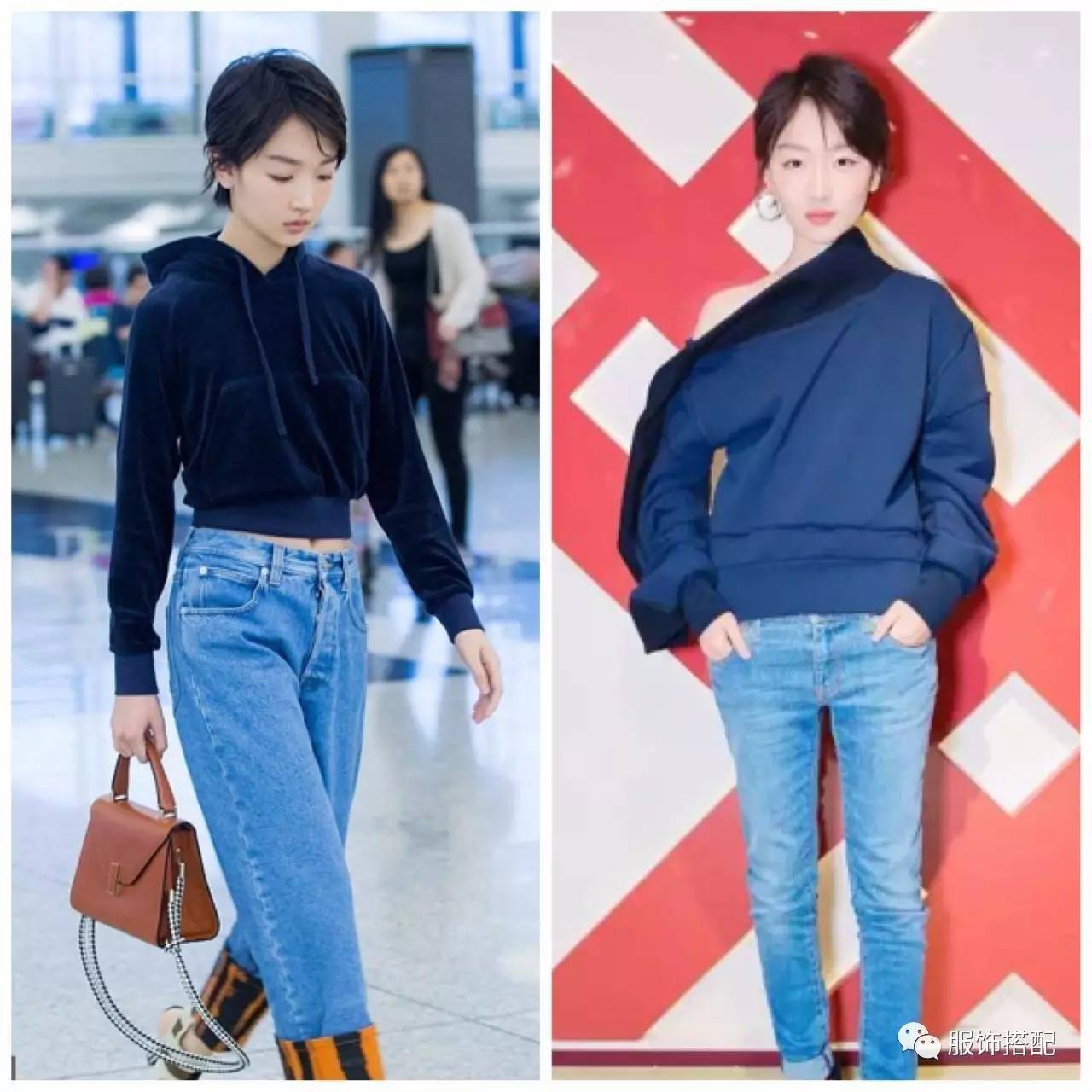 相比于傳統的黑色,這種深牡丹藍有著更出眾的上身效果。像搭姐最近很喜歡的周冬雨,這段時間就非常青睞這種深邃的藍色。無論是深牡丹藍的絲絨衛衣亦或斜肩裝,她只需簡單搭配牛仔褲就足夠chic。