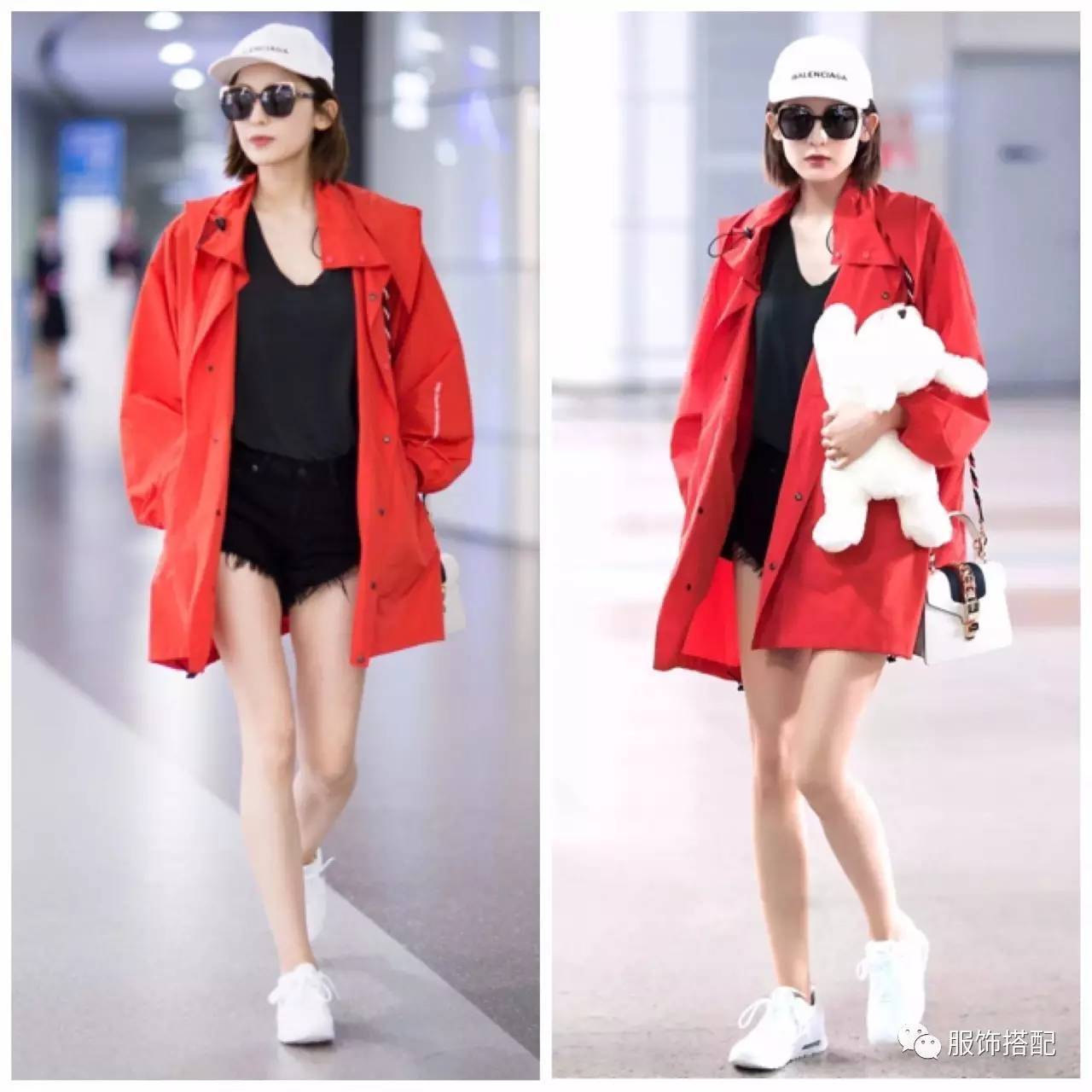娜扎入手的石榴紅風衣毫無疑問要比基礎款卡其色or軍綠色風衣吸睛得多,但她巧妙得選擇了黑tee+黑色短打的全黑內搭來中和,既削弱了紅色風衣的張揚感,還增添了幾分瀟灑酷勁,又美又帥。