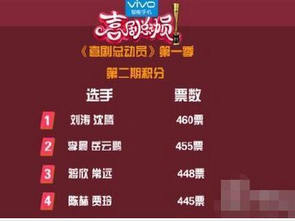 浙江衛視綜藝《喜劇總動員》第二期節目中,第一階段的第二場排位賽正在火熱的舉行中,劉濤、沈騰首度將電影級別的爆破布景帶上舞臺為大家表演了作品《我叫安德烈》,本期積分第一位460票;蔣欣、常遠動情演繹“北漂”愛情故事引發全場共鳴,本期積分448票,積分排在第三位;李晨、岳云鵬為刷新成績祭出“子母哏”王牌,本期積分455票,排在了第二位;陳赫、賈玲爆笑上演《泰坦尼克號》組成“款實”CP;在愈加緊張激烈的比拼中,激發了競演嘉賓們的創作靈感,為觀眾帶來了多重視聽震撼。那么喜劇總動員最后冠軍是誰得第一?喜劇總動員第二期積分陳赫賈玲為什么是排名最后?